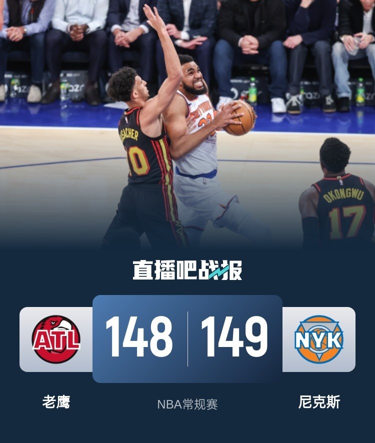开场后没多久尼克斯就在布伦森的带领下建立领先,布伦森单节轰下14分。第二节唐斯接连砍分帮助尼克斯将分差拉大到18分,但随后尼克斯进攻突然断电,老鹰多点开花一波16-2的反扑将比分追上,依旧是唐斯站出来连续拿分为尼克斯稳住阵脚。易边再战,两队依旧是大打对攻战,虽然尼克斯率先打出攻势,但老鹰后程发力再度掀起反扑缩小分差。最后一节两队依旧打得十分胶着,老鹰一度在第四节末段追到只差1分,布伦森关键时刻连得5分,尼昂三分续命,尼克斯连续犯罪让老鹰通过罚球追平比分进入加时。加时赛中尼克斯发挥稍胜一筹,布伦森投进关键中投,最终尼克斯149-148加时力克老鹰。