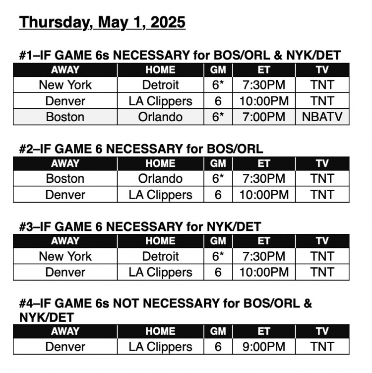 4月28日讯 今天,NBA官方公布了季后赛首轮G6在5月2日这天的比赛时间安排,具体如下: