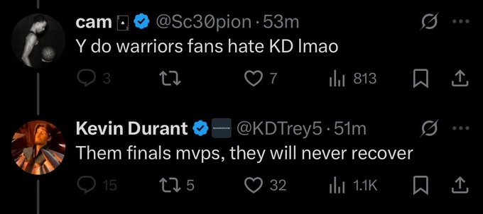 球迷B:“KD绝对是勇士队内最佳球员。当他登场时的效应非常明显。我可以举出许多例子,但推特字数有限制。”