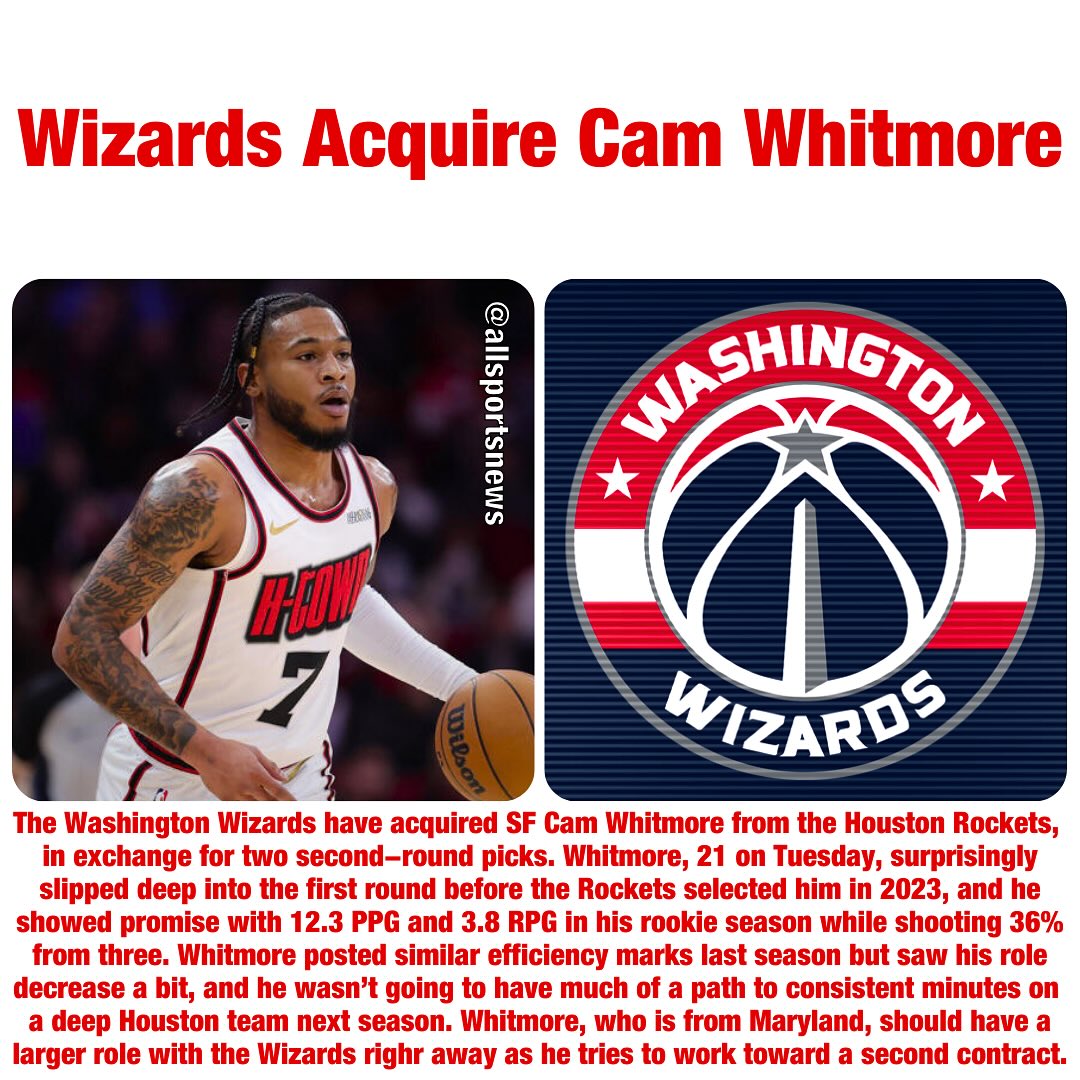 07月06日讯 据ESPN名记Shams Charania报道,多位消息人士透露,火箭将2023年20号秀、侧翼球员惠特摩尔送至奇才,换来两个次轮签(2026年...