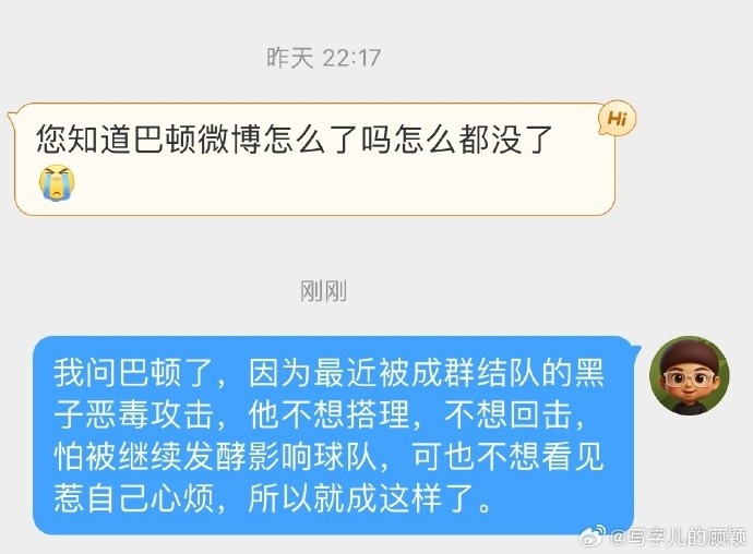 最近巴顿的个人社交媒体里,料想更是塞满了垃圾和恶意,去扔垃圾、去作恶的人自己知道。我不担心从此往后,巴顿会在工作中懈怠,我只担心他的开朗、明媚被吹散了。