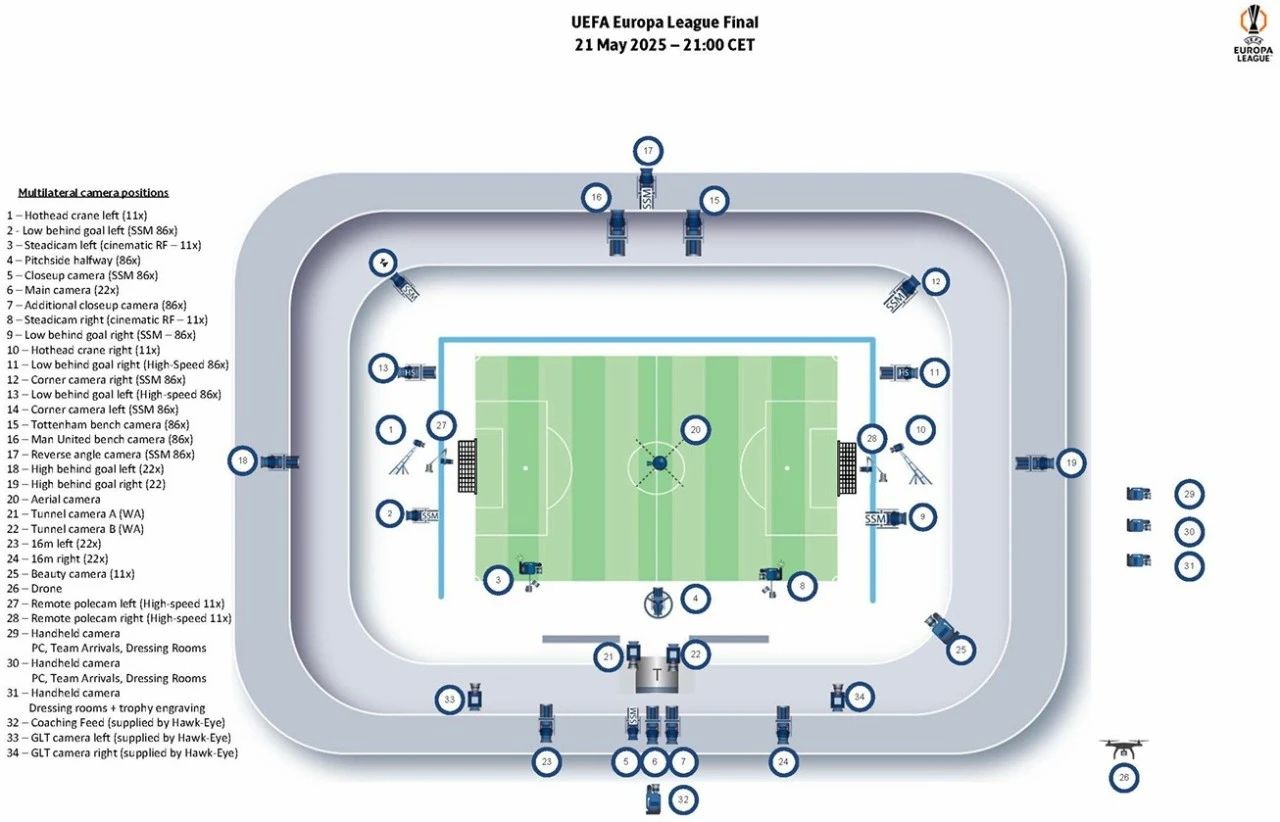欧足联旗下共有三大俱乐部赛事,在顶级的冠军联赛之下,还有欧联杯和欧协联。赛事的等级不同,转播的规模、制作的标准、机位的配置都不同。最后附上欧联杯和欧协联的机位图,可以做一下对比和参考: