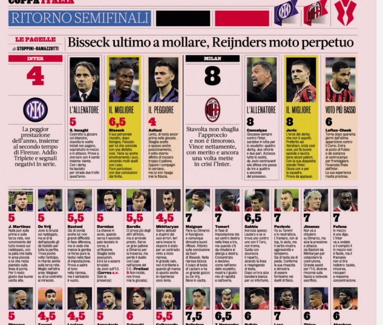 4月24日讯 意大利杯半决赛次回合,米兰3-0国米并以4-1的总比分击败对手晋级决赛,《米兰体育报》赛后给双方球员评分。附米体为米兰德比评...