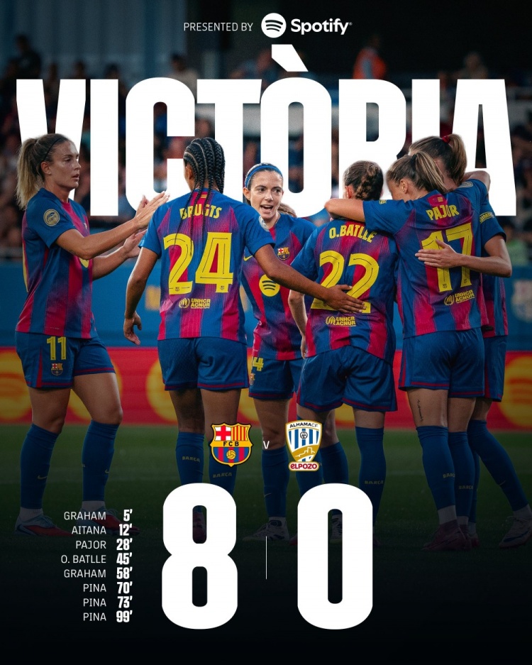 残暴友尽局!巴萨女足西甲首轮8-0狂胜升班马,皮纳上演帽子戏法