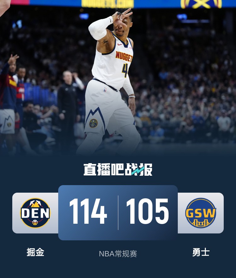 首节之争掘金虽然阵容不整但仍然能够在拉锯战中占据上风,勇士则是自乱阵脚,最后时刻7次罚球机会就命中1球,掘金则抓住机会送上一波8-0的攻势确立起领先;次节开局勇士回敬6-0的攻势追上比分,但勇士状态不够稳定节中又一次熄火,掘金则送上17-3的攻势一举拉开比分并奠定半场12分的优势。休息归来勇士尝试各种方法但总是无法阻止对手导致分差一直在10分左右徘徊,末节勇士依靠连续罚球缩小至3分,但回头又哑火无法得分导致分差重新被拉开;威少读秒阶段的中投将分差重新拉大至10分杀死比赛。最终,掘金客场终结勇士7连胜,同时也将双方的交手连胜扩大至9场。