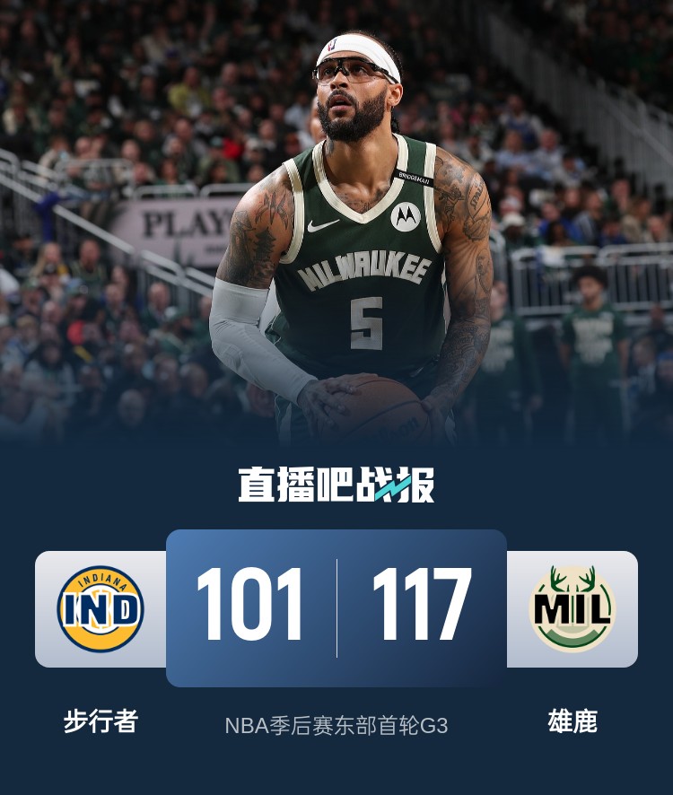 比赛开始,双方开场势均力敌,比分交替领先,字母哥高效输出,步行者多点开花给出回应,次节双方继续缠斗,比分始终紧咬,哈利伯顿穿针引线连送助攻,库兹马连得5分顽强咬住,步行者突然发力打出10-0的攻击波,以57-47领先雄鹿结束上半场。易边再战,特伦特神兵天降,单节轰进5记三分独得18分,雄鹿攻防两端压制对手单节净胜21分,末节步行者仍无起色,雄鹿乘胜追击将分差拉开到20分杀死比赛。最终,雄鹿117-101逆转大胜步行者,将总比分扳成1-2。