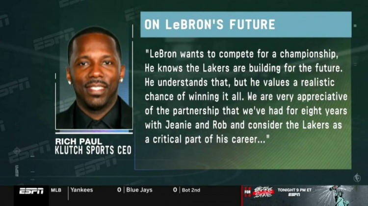 7月1日讯 今日,ESPN湖人随队记者Dave McMenamin在电视节目中进一步报道了在詹姆斯执行球员选项后,其经纪人里奇-保罗所发布的声明。