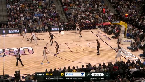 3月8日讯 NBA常规赛,太阳客场挑战掘金。太阳29胜33负排在西部第11,掘金40胜22负高居西部第3。比赛开始,双方开场短暂相持,随后约基奇得...
