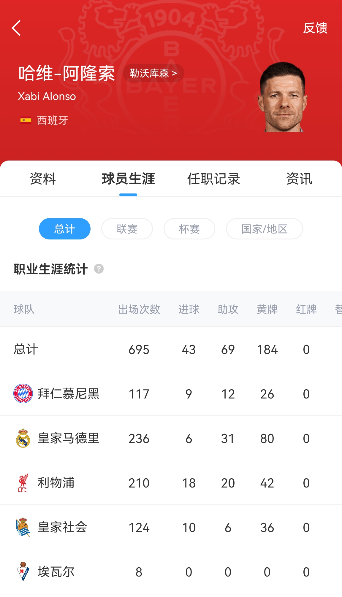 阿隆索球员生涯效力过5支球队,分别是青训球队皇家社会、埃瓦尔(短暂外租效力)、利物浦、皇家马德里和拜仁。