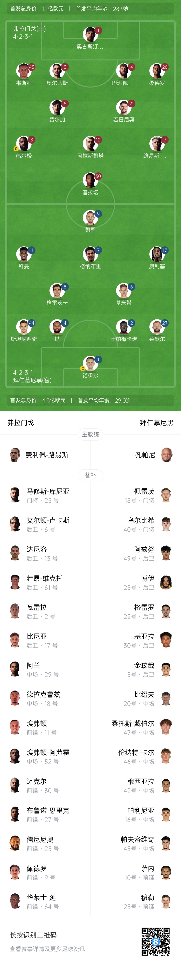 弗拉门戈首发:1-奥古斯汀-罗西、3-奥尔蒂斯、4-里奥-佩雷拉、26-桑德罗、43-韦斯利、5-普尔加、8-热尔松、10-阿拉斯凯塔、21-若日尼奥、7-路易斯-阿劳霍、50-普拉塔