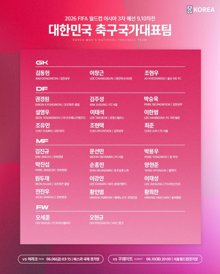 稳小组头名,韩国队6月18强赛名单:孙兴慜、李刚仁、黄喜灿领衔