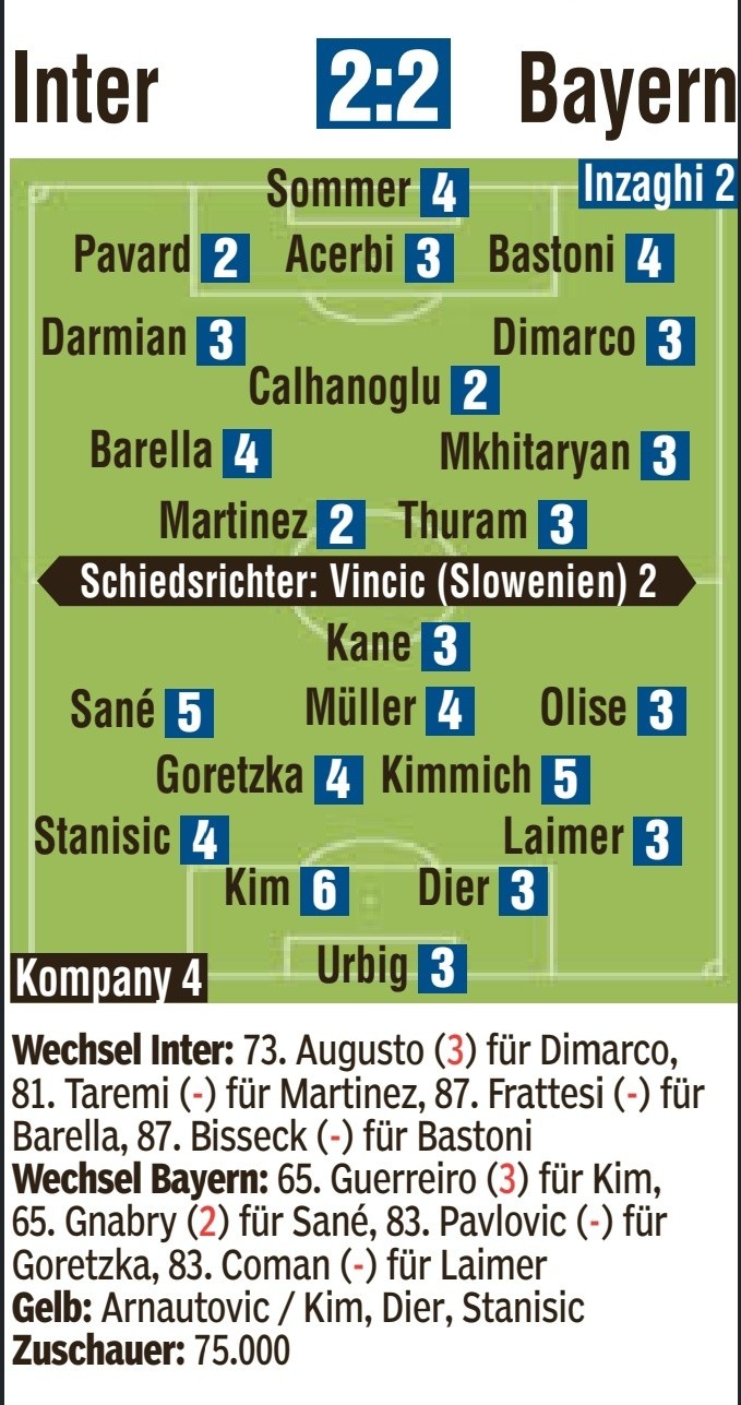国米vs拜仁图片报评分:劳塔罗、恰20最高,金玟哉获超低分6分